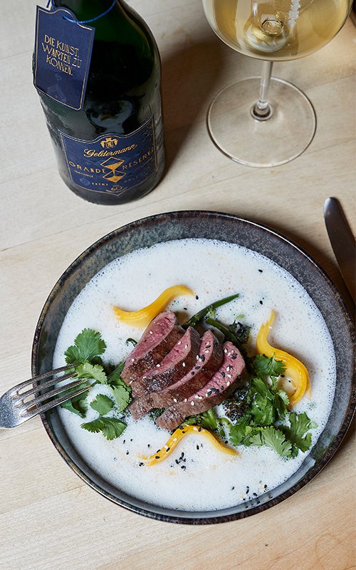 Zarte Röstnoten und Aromen von gelbem Pfirsich und roten Beeren machten unsere neue Grande Réserve zum perfekten Begleiter der rosa gebratenen Rehkeule im Tom Kha-Sud mit Edamame, Brokkoli, und frischer Mango.